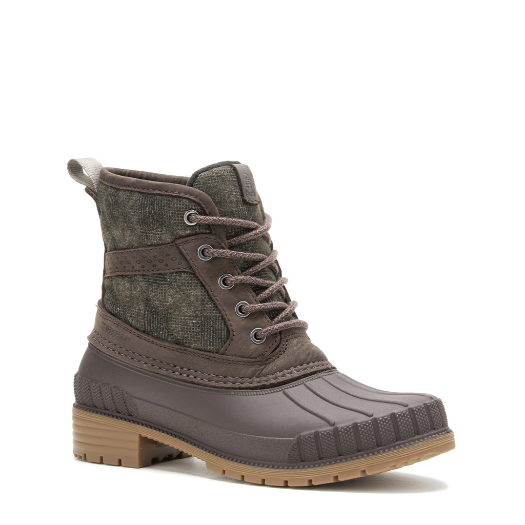 - Upper: Waterproof leather and water-resistant quilted flannel/knit