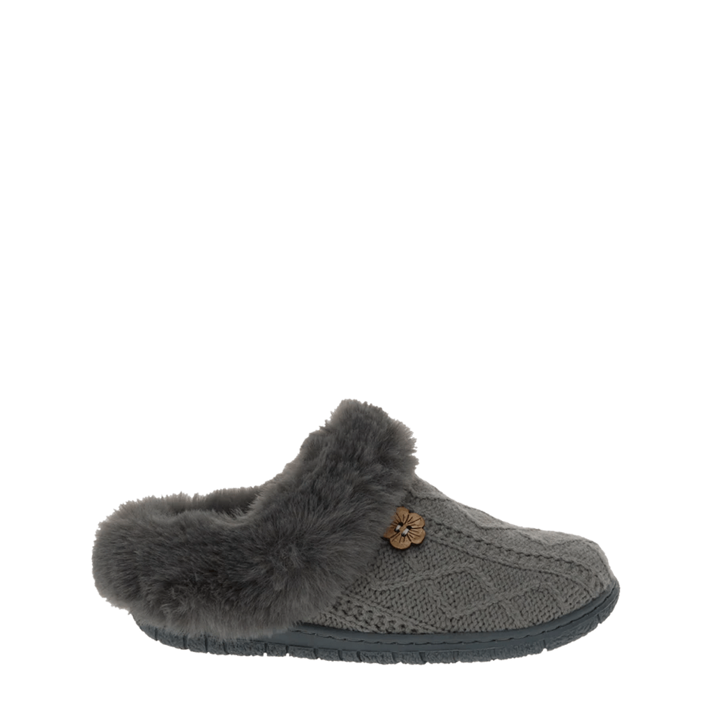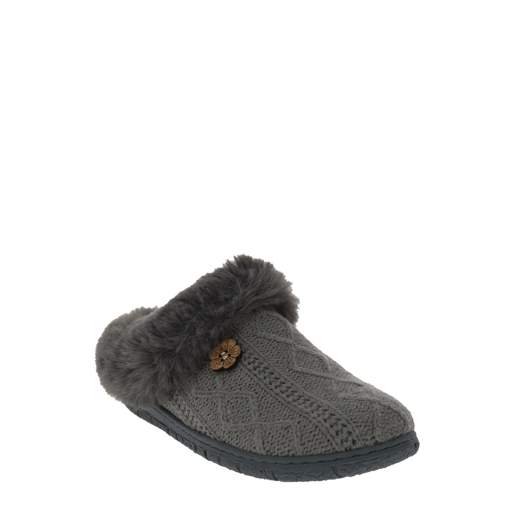 Wrap your feet in softness with the Foamtreads Loom, a slipper that blends luxurious comfort with charming style. This women’s slip-on features a warm knit upper paired with a plush faux fur collar and lining for that instant cozy feel. Inside, a cushioned memory foam insole molds to your foot with every step, offering gentle support whether you're lounging indoors or stepping out briefly. The rubber outsole adds durability and traction, so you can move from room to doorstep with ease. Finished with a decorative button detail, the Loom is a feel-good essential for cooler days and cozy nights.