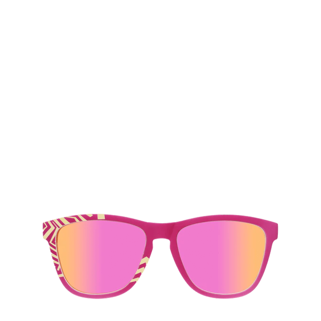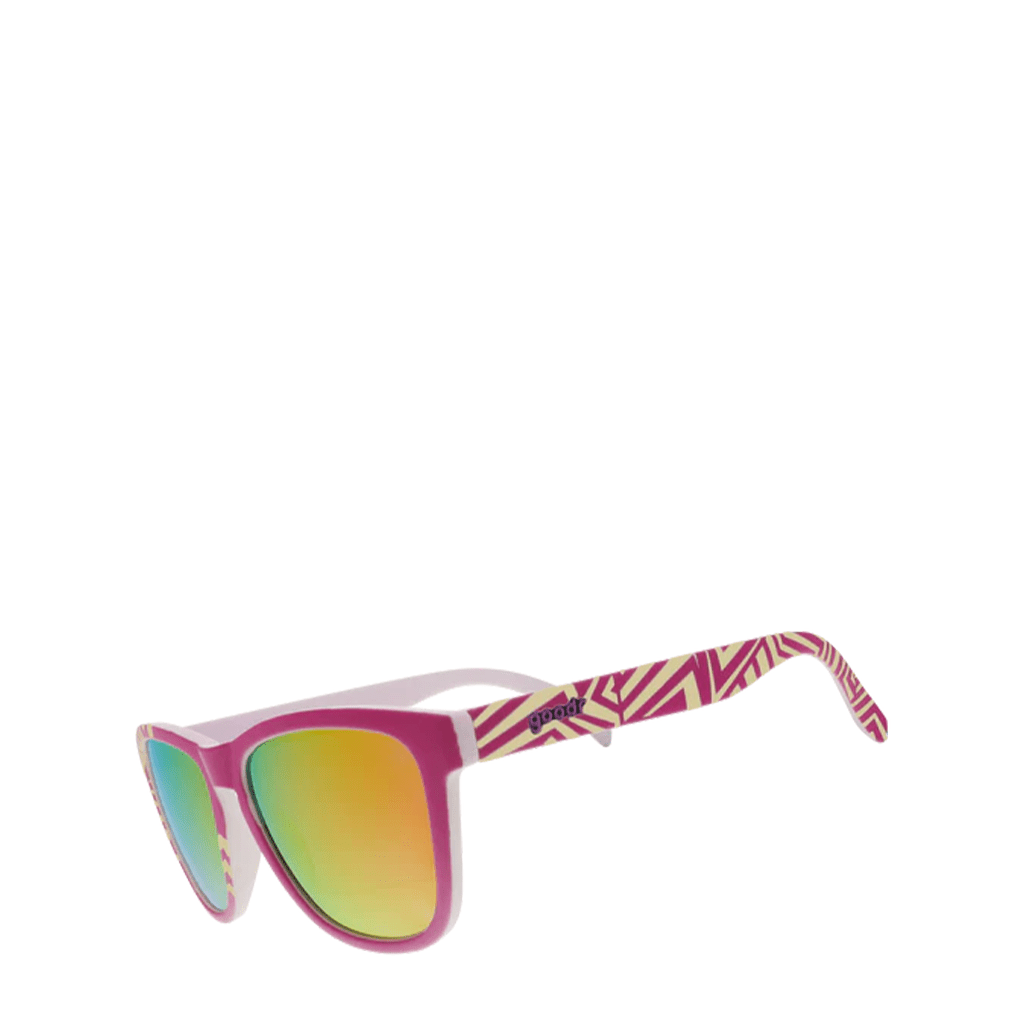 Make a statement with these daring and dynamic unisex polarized sunglasses that change color with your mood... or at least with UV exposure. These limited-edition shades start off subtly off-white, then explode into brazen purple and acid yellow when hit with sunlight, thanks to UV-activated tech. Paired with pink reflective lenses, this look is bold, unapologetic, and made for anyone who refuses to blend in. Built with Goodr’s no-slip, no-bounce design, they’re perfect for high-energy adventures and sunshine-fueled struts through life’s runway.